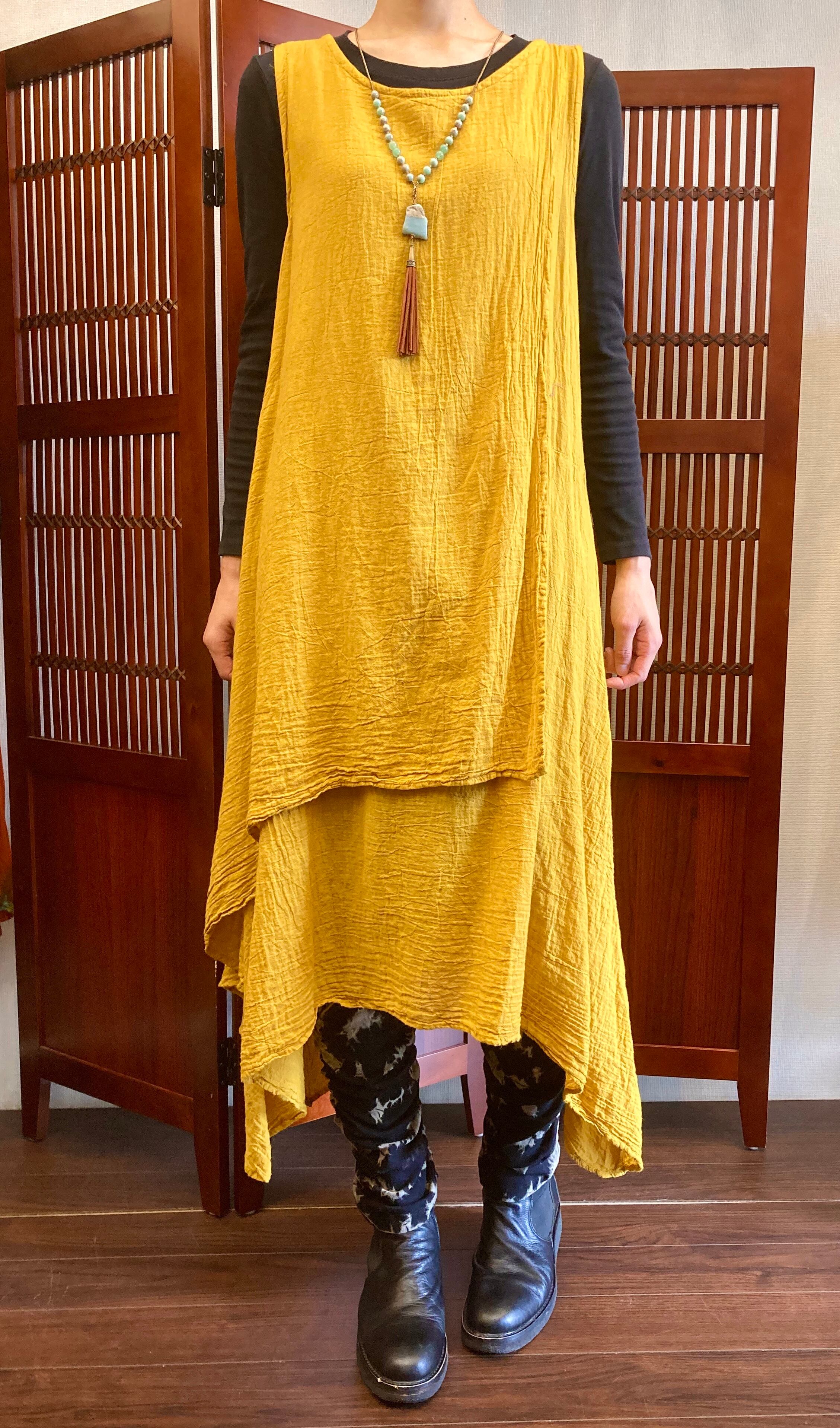 春夏は1枚でサラリと着られ、秋冬は長袖のインナーを入れて楽に重ね着もできます。