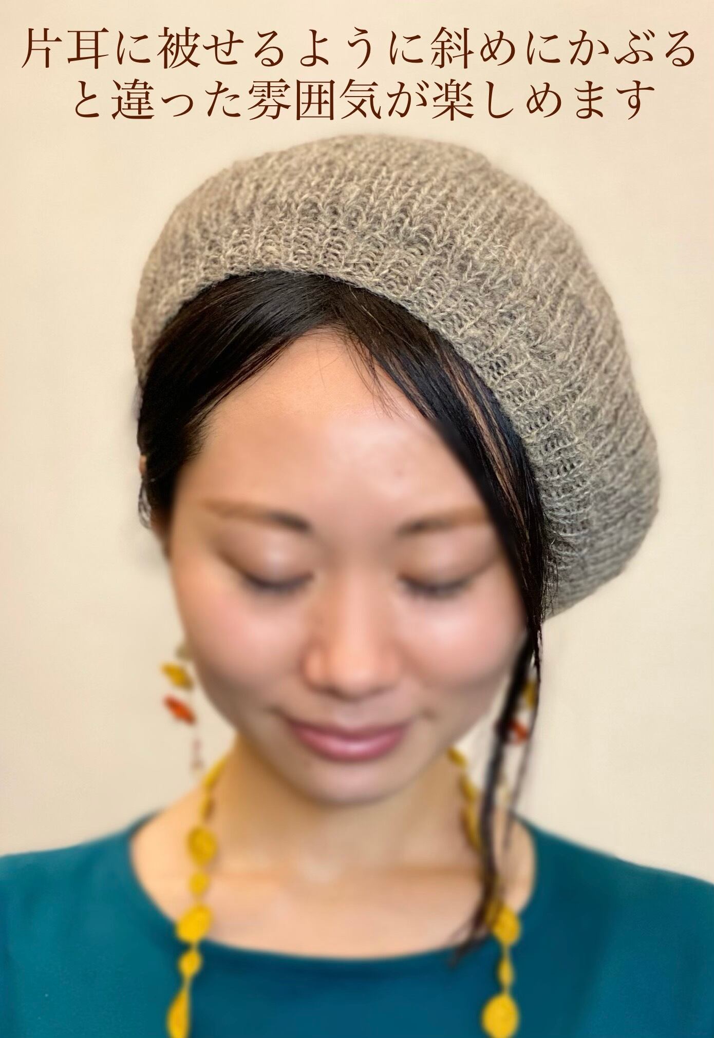 ベレー帽=難しいというイメージを覆えすように、そのまま軽く乗せても斜めに角度をつけても自然と素敵な形に収まります。